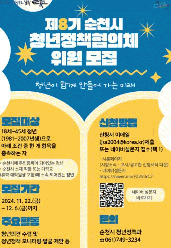접수기간은 11월 22일부터 12월 6일까지 2주간이고, 신청 방법은 순천시청 홈페이지(고시/공고)에서 신청서를 내려받아 작성 후 순천시 청년정책과 담당자 이메일 또는 네이버 설문지로 제출하면 된다.