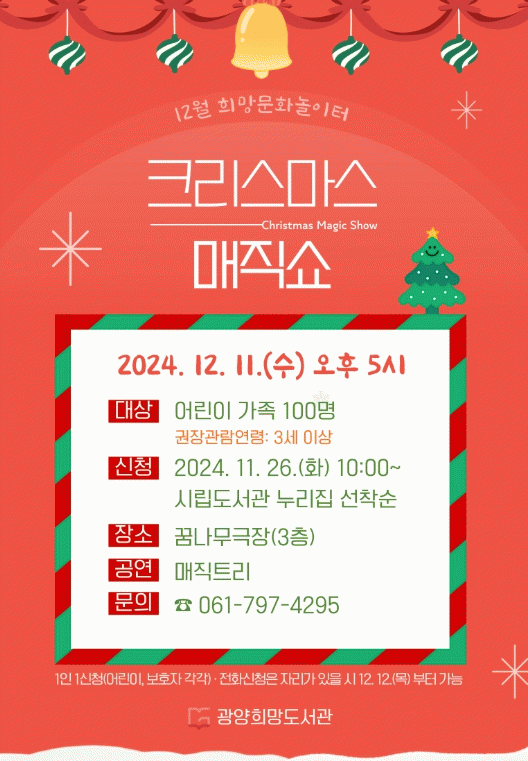 남수향 희망도서관팀장은 “한 해 동안 어린이들의 반응이 가장 좋았던 공연을 한데 모은 매직쇼와 크리스마스 이벤트를 준비했다. 광양희망도서관을 찾아 가족과 함께 따뜻한 연말 보내시길 바란다”고 말했다.