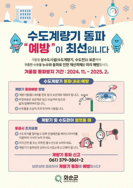 박종옥 상하수도사업소장은 “계량기 동파 예방은 가정과 사업체에서 1차 적으로 조치한다면 충분히 막을 수 있고, 지속되는 한파에 계량기가 동파되면 신속히 화순군 상하수도사업소 물관리팀(☎061-379-3862)에 신고하여 주시길 바란다.”라고 당부했다.
