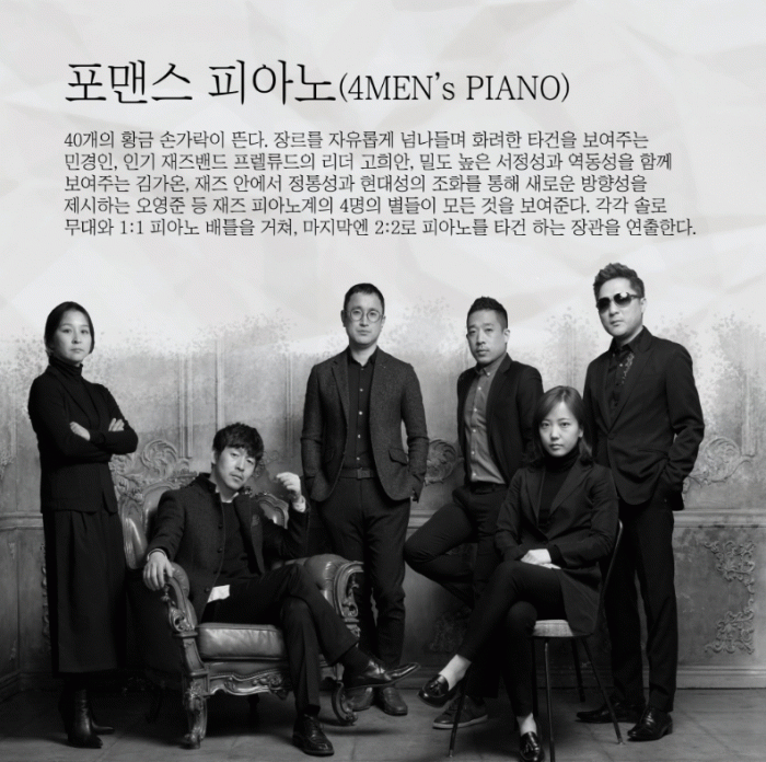2회차 공연의 주인공인 포맨스 피아노(4Men’s Piano)는 국내 최정상급 피아니스트 4인으로 구성된‘누구도 흉내 낼 수 없는 건반 위 황금 손가락’이라고 불리는 재즈 피아노 그룹으로, 이번 공연에서 멤버 간 화려한 피아노 배틀로 ‘Spain’, ‘Shape of My Heart’, ‘The Girl from Ipanema’ 등의 명곡을 피아노 앙상블로 재해석할 예정이다.