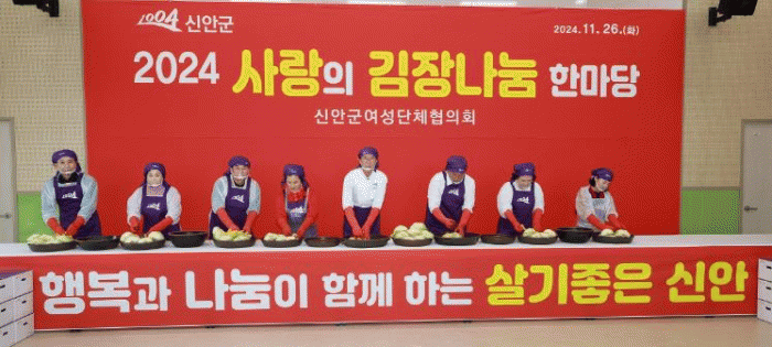 사랑의 김장나눔 행사는 매년 신안군여성단체협의회에서 주관하여 여성들이 김장김치를 담가 관내 소외 이웃 및 경로당에 전달하는 나눔 행사로 올해는 31,420포기의 김장김치를 취약계층 4,883세대 및 경로당 413개소에 전달할 계획이다.