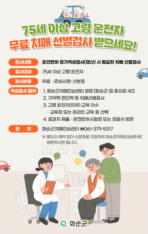 검사를 원하거나 받아야 하는 고령 운전자는 신분증을 지참하여 화순군치매안심센터를 방문해 검사를 무료로 받고, 교통안전 교육기관에 제출할 검사 결과지를 발급받아 운전면허 시험장이나 경찰서에 제출하면 된다.