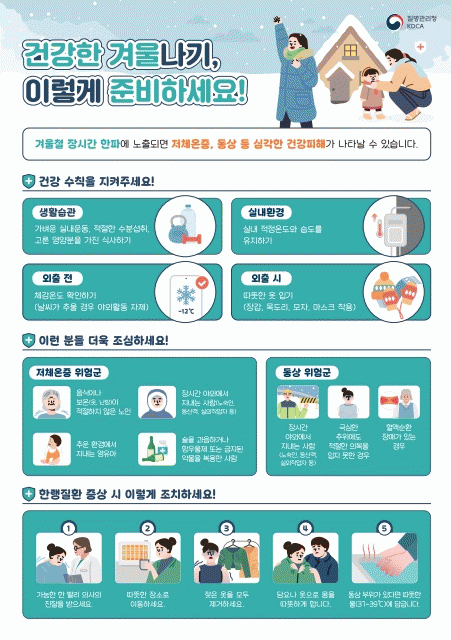 특히, 면역력이 취약한 노인과 소아, 추위에 대한 인지가 어려운 음주자, 겨울철 야외작업이 잦은 근로자 등은 각별한 주의가 요구된다.