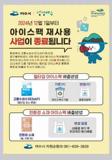 하지만 최근 환경부에서 젤 타입 아이스팩에 대한 폐기물부담금제를 시행함에 따라 배출량이 급감한 데다가 물이나 전분 등 친환경 소재의 아이스팩이 사용되면서 여수시도 재활용을 중단하기로 했다.