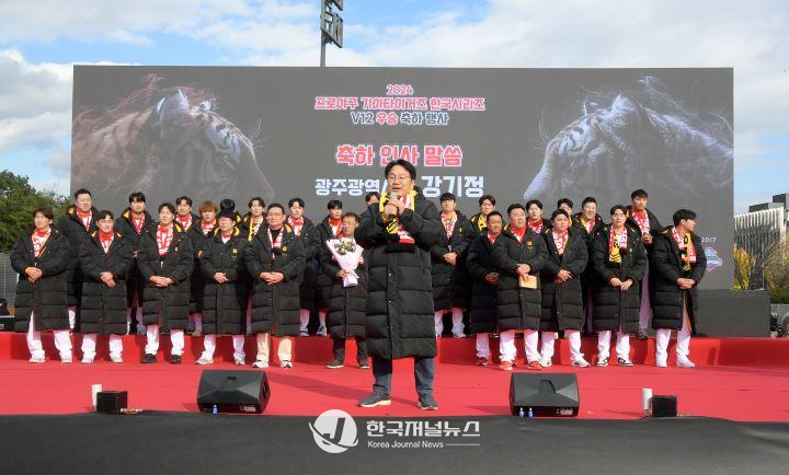 강기정 광주시장은 “한강 작가 노벨문학상 수상 등 광주에 기쁜 일이 계속되고 있는 가운데 KIA 타이거즈 한국시리즈 우승은 ‘광주의 힘’이다”며 “선수 개인의 영광을 넘어 광주의 전반적인 에너지를 끌어올리고 활력을 더했다. 내년에도 광주시민들과 함께 뜨겁게 응원하겠다”고 밝혔다.
