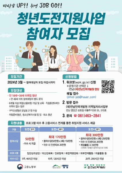 고용노동부의 청년 도전 지원사업은 취업난과 비정규직 일자리 등으로 구직을 단념하거나 사회와 단절돼 있는 청년들에게 도전 기회를 제공하는 내용.