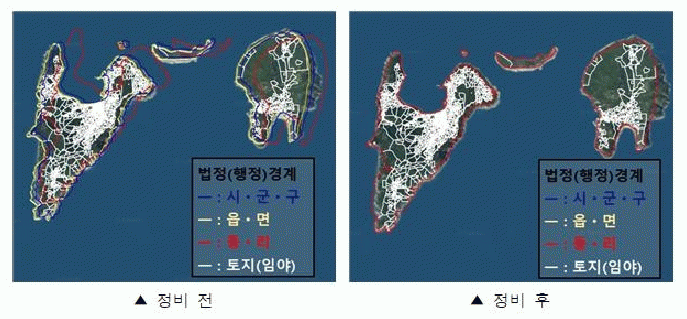 시는 남면, 화정면, 삼산면 등 섬 지역 법정구역(시군구, 읍면, 동리) 경계가 부동산종합공부시스템과 불일치해 도면의 필지별 경계 정보와 위성영상 및 법정구역 경계를 활용하여 오류자료를 정비했다고 밝혔다.