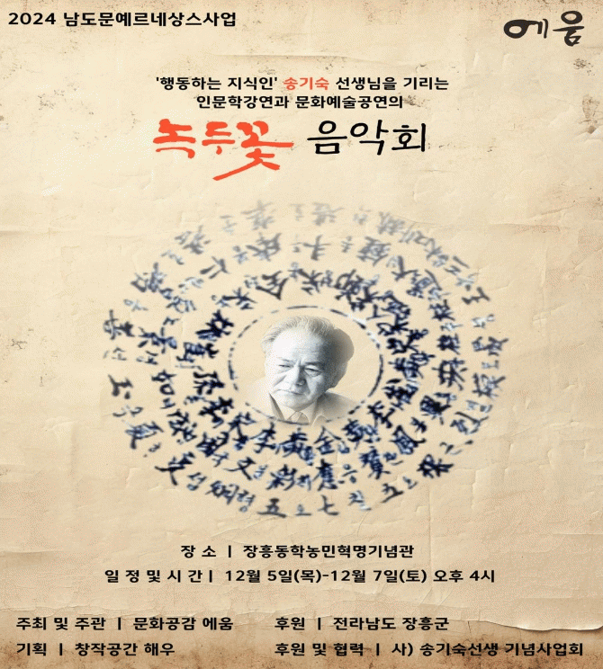 이번 녹두꽃 음악회는 전라남도와 장흥군이 후원하고 사)송기숙선생기념사업회가 협력하며, 전남전문예술단체 ’문화공감 에움‘이 기획, 연출한다.