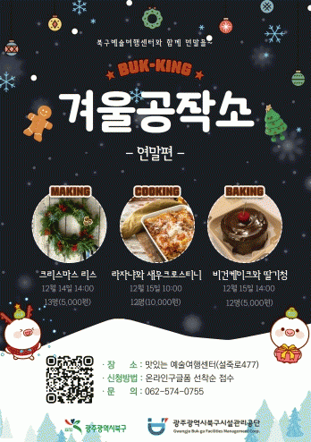 북-킹 ‘겨울공작소’는 문화예술교육 ‘라이트스튜디오’, 양식 레스토랑 ‘폼(fo_m)’, 제로웨이스트카페 ‘뭉몽만남’의 광주 청년 소상공인을 강사로 초빙해 주민들과 한층 더 가까운 프로그램을 운영한다. 연말을 맞이해 광주를 방문하는 관광객과 시민들에게 북구에서 따뜻한 기억을 만드는 시간이 되길 바란다.