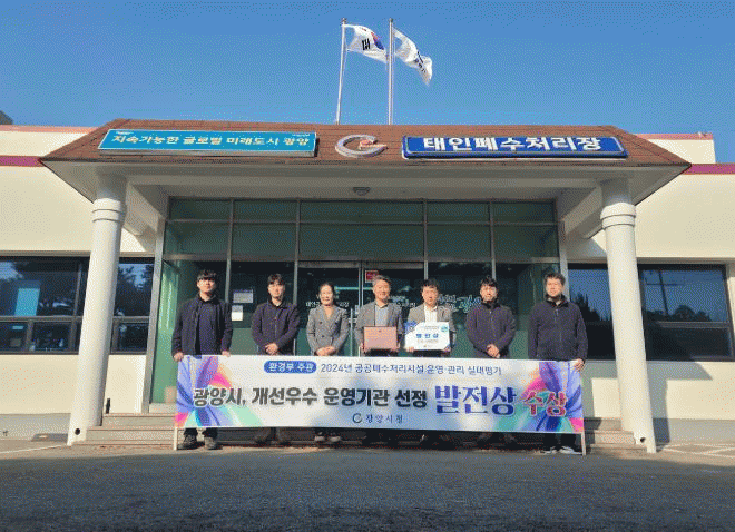 광양시는 개선우수 운영기관으로 선정됨에 따라 지난달 28일부터 29일까지 제주도에서 열린 공공폐수처리시설 연찬회에서 ‘발전상’을 수상해 포상금 및 인증패를 받았다.