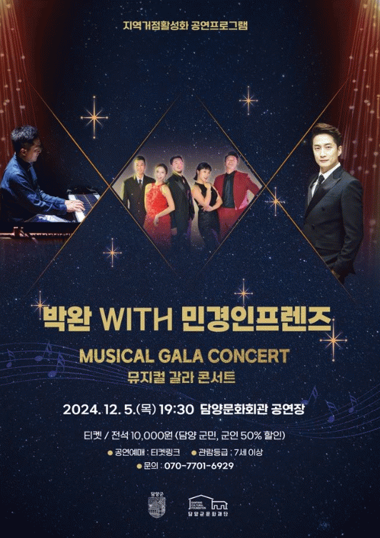 [한국저널뉴스](재)담양군문화재단은 오는 5일 저녁 7시 30분 담양문화회관 공연장에서 박완 with 민경인프렌즈 뮤지컬 갈라 콘서트를 개최한다고 밝혔다.