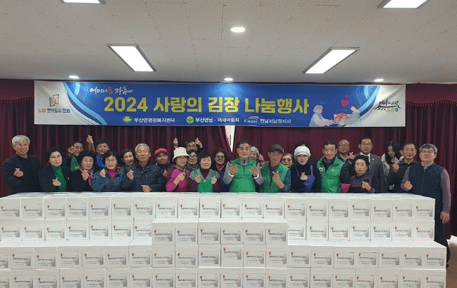 추운 날씨 속에서도 지난 11월 30일부터 이틀간에 걸쳐 배추를 자르고 절였고, 재료 및 양념 만드는 등 사전 준비를 했으며, 김장 당일엔 부산면 남․여새마을회원 및 자원봉사자들과 부산면 직원들 민․관이 모두 힘을 하나로 합쳐 김장김치 450포기를 담갔다.