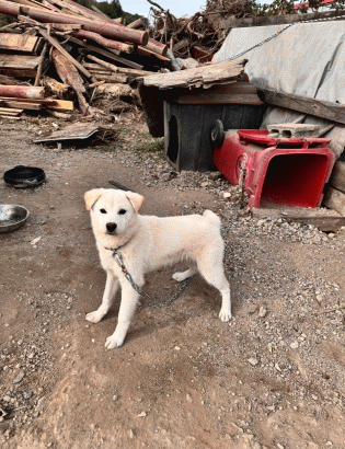 삼도동에 있는 흰돌이는 1~2m짜리 자그마한 반원 안에 갇혀 1m 목줄로 그릴 수 있는 원 안에서 먹고, 자고 생활하고 있다.