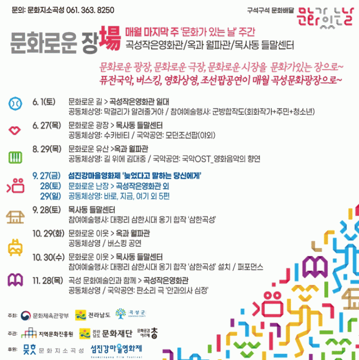 9월에는 문화가 있는 날 주간에 제3회 섬진강마을영화제와 함께하는‘늦었다고 말하는 당신에게’라는 슬로건으로 자연환경의 위기속에 조화로운 마을공동체의 공존을 이야기해보며 문화의제가 일상과 결코 분리되지 않고 우리가 마땅히 누려야 할 생활 속 문화로운 삶에 대한 근원적 물음을 던져보는 시간을 가졌다.