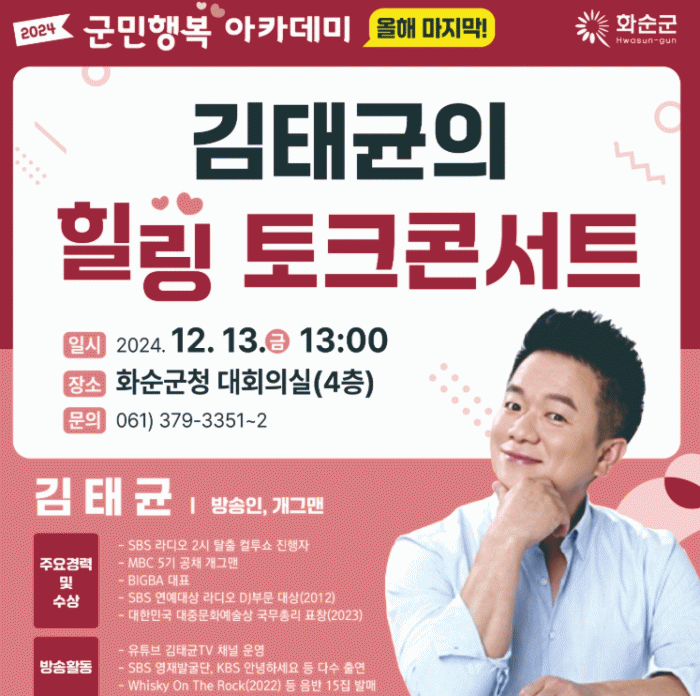 조미화 인구청년정책과장은 “연말에 재미와 감동을 동시에 줄 수 있는 강연을 준비한 만큼 많은 군민이 함께 하길 바란다.”라고 전했다.