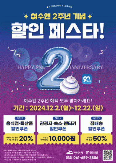 시 관계자는 “여수엔 출시 2주년을 기념하며 다양한 할인 혜택을 준비했다”며 “할인 이벤트와 함께 가족, 친구, 연인과 즐거운 연말 보내시고, 앞으로도 많은 이용을 부탁드린다”고 말했다.