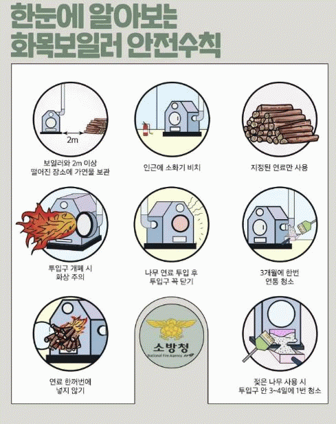 보일러의 효율성을 유지하고 화재 위험을 줄이기 위해 3개월마다 연통을 청소하고, 젖은 나무를 사용하는 경우에는 투입구와 연통을 3~4개월에 한 번씩 점검 및 청소해야 한다. 이러한 정기적인 관리가 화재 예방의 핵심이다.