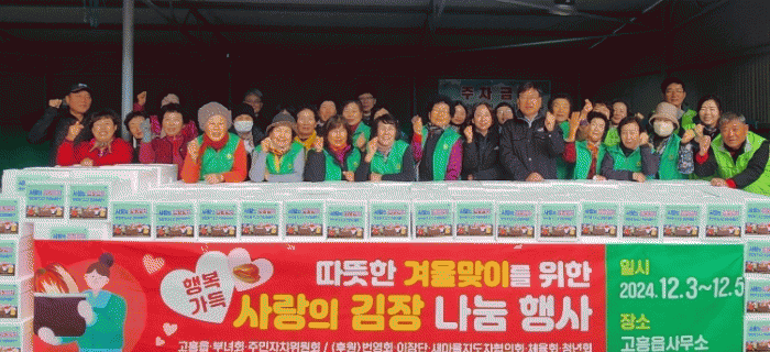 이번 행사는 고흥읍 주민자치위원회(위원장 고명준)와 새마을부녀회(회장 이점남)가 공동으로 주관했으며, 배추 800포기로 담근 김장 김치를 마을 경로당 43개소와 지역의 어려운 이웃 300여 가구에 전달해 따뜻한 마음을 나누기 위해 마련됐다.