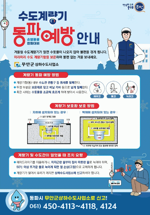 한편, 동파로 인한 수도시설 교체가 필요할 경우 상하수도사업소 공동주택의 경우에는 관리사무실로 연락)에 신고하면 조치를 받을 수 있다.