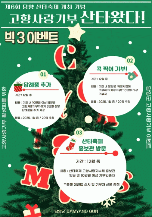 기간 내 전남 담양군에 10만 원 이상 기부자에게 추첨을 통해 답례품을 추가 증정하는 ‘답례품 추가 증정 이벤트’와 함께 11월 모금을 개시한 담양군 지정기부에 참여하는 기부자에 추가 답례품을 증정하는 ‘콕 찍어 기부!’가 진행된다.