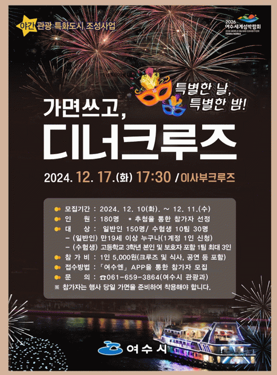 ‘프라이빗 디너크루즈’는 가면을 쓰고 여수 밤바다를 만끽하는 야간관광 특화도시 관광상품으로, 참가자들에게 특별한 밤을 선사할 예정이다.