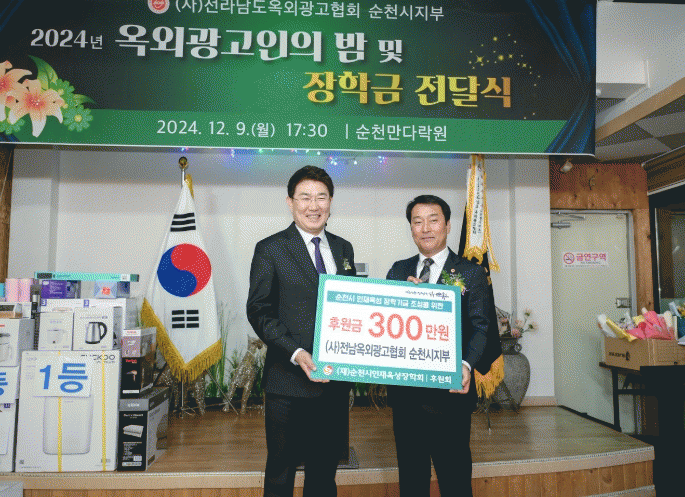 이날, 사단법인 전라남도 옥외광고협회 순천시지부에서는 후진양성에 힘써 달라며 순천시인재육성장학회에 3백만원을 기탁했으며, 학업성적이 우수하고 타의 모범이 되는 학생들 5명에게 각각 40만 원씩 장학금을 전달했다.