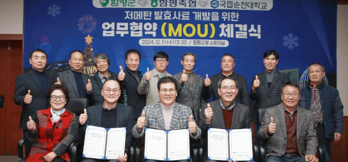 이번 업무협약은 저 메탄 발효사료의 연구개발을 위해 함평축산농협, 국립순천대학교 상호 간 협력체계 구축 및 공동 발전을 위한 것이다.