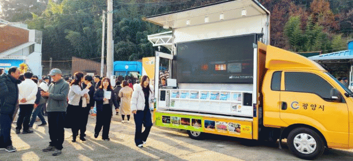 광양시 이동형관광안내소는 따스한 햇살의 느낌을 살린 노란색 차량에 광양관광 이미지를 랩핑하고 홍보영상 스크린과 리플릿 비치 기능을 도입한 움직이는 관광안내소다.