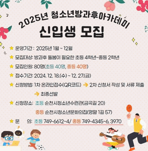 청소년방과후아카데미는 여성가족부와 순천시가 지원하는 국가정책사업으로 방과 후 돌봄이 필요한 청소년들에게 학습 지원, 체험 활동, 자기 개발 활동, 생활관리, 특성화 프로그램 등 종합 서비스를 제공하는 프로그램이다.