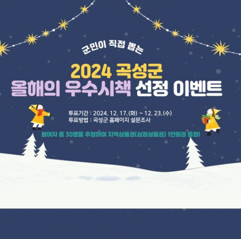 이번 설문조사는 12월 23일까지 군 홈페이지를 통해 군민이면 누구나 참여할 수 있으며 참여자를 대상으로 추첨을 통해 지역상품권인 심청상품권 1만 원권을 증정할 예정이다.