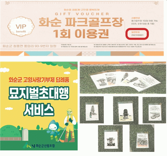 추가 선정된 답례품은 ▲공(예)산품(운주사·화순8경 엽서세트) ▲관광·체험서비스(파크골프장 이용권) ▲기타(묘지 벌초대행 서비스) 3개 업체 3개 품목이다.