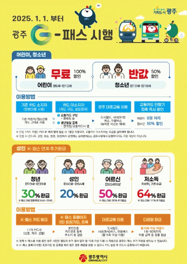 광주광역시는 2025년부터 시내버스·마을버스·도시철도 등 대중교통 요금을 어린이 무료, 청소년 반값으로 할인하고, K-패스와 연계해 청년 30%, 성인 20%, 어르신 50%, 저소득 64%를 환급한다.