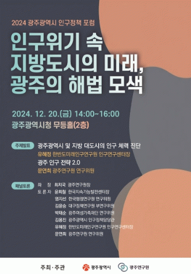 광주광역시는 광주연구원과 함께 20일 오후 2시 시청 무등홀에서 ‘2024년 광주시 인구정책 포럼’을 개최한다.