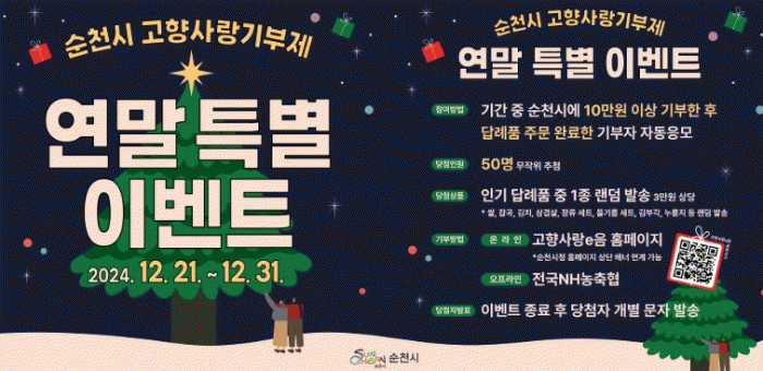 시 관계자는 “연말정산 시즌을 맞아 고향사랑기부제 활성화와 감사의 마음을 전하고자 인기 답례품 추가 증정 이벤트를 지난 11월에 이어 추가로 준비했으니, 많은 분들의 참여를 부탁드린다”고 말했다.