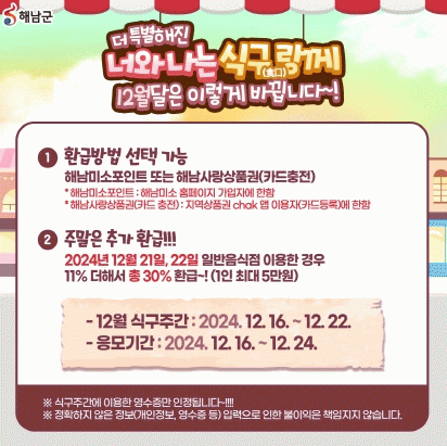 군은 연말을 맞아 12월 식구주간(12.16.~12.22.)에는 기존대로 19%를 환급하고, 12월 21~22일, 28~29일에는 기존 19%에서 11%를 더한 30%까지 환급을 실시한다.