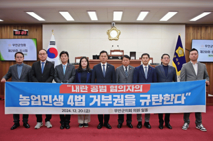 군의회는 성명서를 통해 “농민은 기후 재난과 생산비 폭등, 쌀값 폭락으로 소상공인은 얼어붙은 경기와 계엄 후폭풍으로 벼랑 끝에 서 있다”며 “내란 공범 혐의자에 의해 행해진 농업・민생 4법에 대한 거부권 행사는 묵과할 수 없는 또 한 번의 폭거”라고 비판했다.