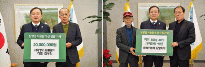 담양군에 따르면, 쌍교숯불갈비(대표 김창회)에서 현금 2천만 원, 흑염소협회 담양지부(회장 정용환) 백미 10kg 40포, 담양참사랑병원(이사장 이진열) 백세미 10kg 70포를 담양군에 전달했다.
