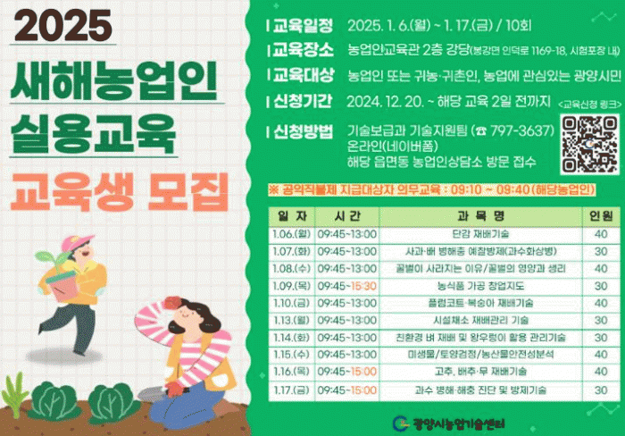 교육기간은 1월 6일부터 1월 17일까지이며 교육 장소는 시험 포장 내 광양시 농업인교육관 2층 강당이다.