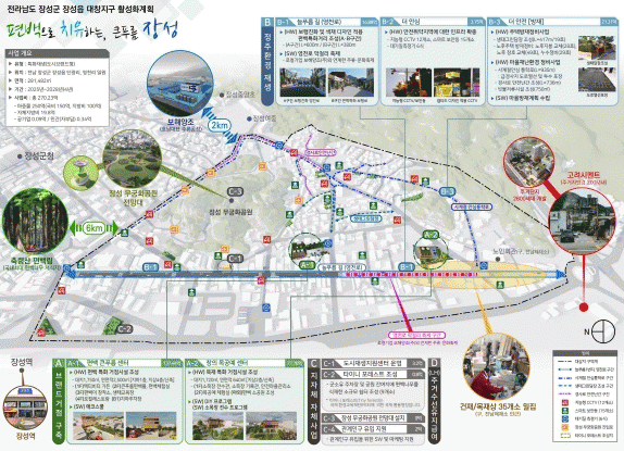 사업은 크게 △거점시설 조성 △정주환경 재생으로 구분된다. 장성군은 사업지 내에 거점시설로 ‘편백큰푸름센터’ 등을 조성한다. ‘편백큰푸름센터’는 장성군의 자랑인 축령산 편백숲 산림자원을 콘텐츠화한 시설이다. 로컬레스토랑, 생태교육장, 편백체험실, 큰푸름편백몰, 액티비티가든 등이 조성된다. 장소는 대창1공영주차장(장성읍 영천리 909-4) 부근이다.