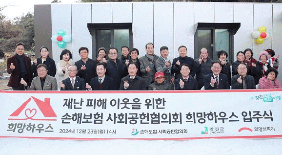 강진원 강진군수는 “피해 주민에게 안정된 주거를 지원한 희망브리지와 손해보험 사회공헌협의회에 감사드린다”라며 “강진군도 재난 피해 주민들의 일상복구를 위해 최선을 다하겠다”라고 말했다.