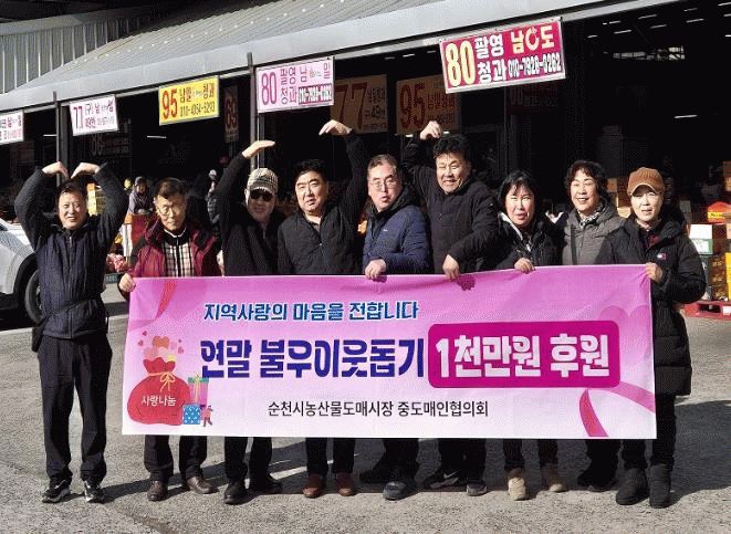 이번 성금은 순천시농산물도매시장 중도매인협의회가 주관하여 황전면, 매곡동 등 9개 면·동에 전달될 예정이다.