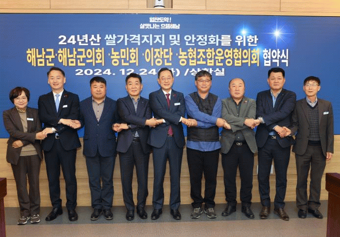 명현관 해남군수와 이성옥 해남군의회 의장, 이무진 농민회장, 추윤석 이장단장, 김경채 지역농협운영협의회장 등이 참석한 가운데 24일 열린 협약식에서는 쌀값 안정과 농민 소득보전이 시급하다는 데 인식을 같이하고, 향후 추진 일정 등에 적극 협력해 나가기로 했다.