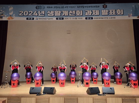 발표는 영광읍생활개선회 줌바댄스 ▲백수읍생활개선회 퓨전북난타 ▲대마면생활개선회 부채춤 ▲묘량면생활개선회 짐볼난타 ▲군서면생활개선회 모듬북 ▲군남면생활개선회 트롯장구 ▲염산면생활개선회 숟가락난타 ▲법성면생활개선회로 진행됐다.