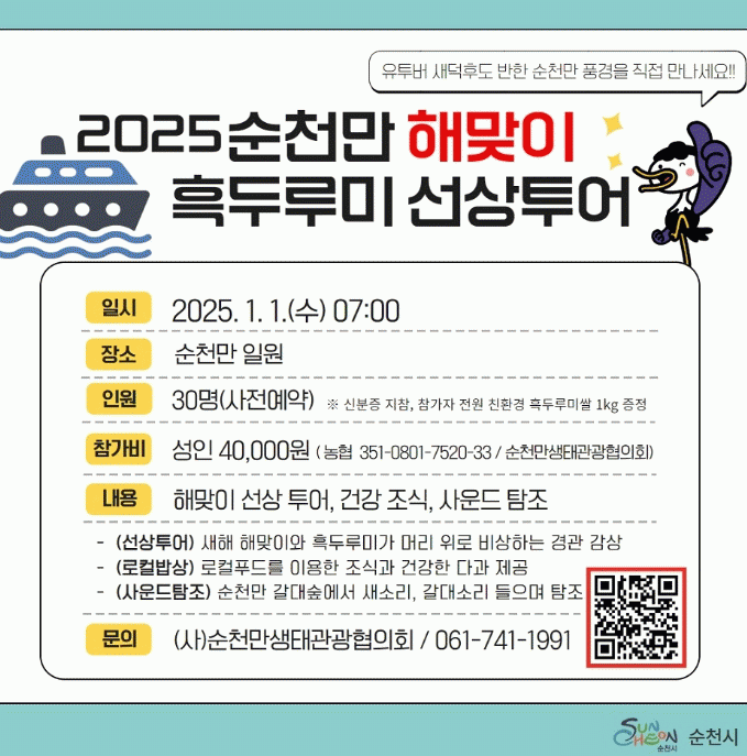 이번 프로그램은 1월 1일 새해 첫날 7시부터 10시까지 운영되며, 김승옥의 단편소설 ‘무진기행’에서 ‘안개나루’라고 불린 대대포구에서 생태체험선을 탑승하여 선상에서 순천만의 황홀한 일출과 함께 탐방객의 머리 위로 비상하는 흑두루미의 군무 등 신비로운 경험을 할 수 있도록 준비했다.