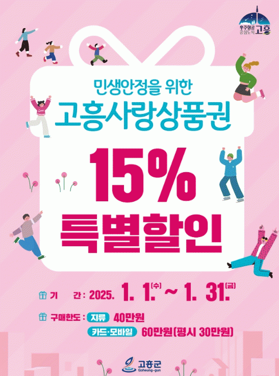 이번 민생안정 고흥사랑상품권 15% 특별할인은 지류, 고흥사랑카드, 모바일 고흥사랑상품권 모두에 적용된다.