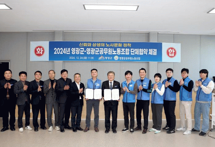 조범기 위원장은 “단체협약이 원만히 체결되도록 영공노가 교섭 요구한 사항에 대해 큰 이견 없이 합의해 주신 영광군에 감사드리며, 앞으로도 노사가 공통의 문제를 함께 해결해 공직자들이 일하고 싶은 직장을 만들어가기를 바란다.”라고 말했다.