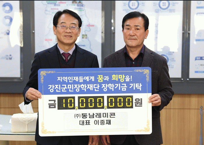(주)동남레미콘 임병호 부사장은 “한 해를 마무리하며 강진군에서 받은 관심과 사랑에 보답하기 위해 어려운 여건에 있는 아이들을 위해 장학금을 기부했다”며 “어려운 여건의 우리 지역 학생들에게 값지게 쓰였으면 좋겠다”고 말했다.