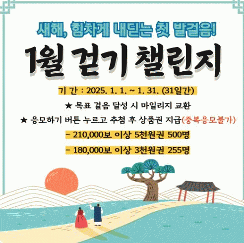 1월 1일부터 1월 31일까지 진행되는 이번 걷기 챌린지는 1걸음에 1마일리지 적립되며 1일 최대 8천 마일리지가 누적된다.