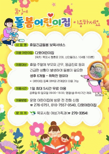 휴일긴급돌봄 어린이집은 양육자가 주말이나 공휴일에 긴급한 상황이 발생했을 때 어린이집에서 아이를 돌봐주는 서비스로, 시는 지난 해 7월부터 북항동 소재 다윗어린이집을 선정해 운영하고 있다.