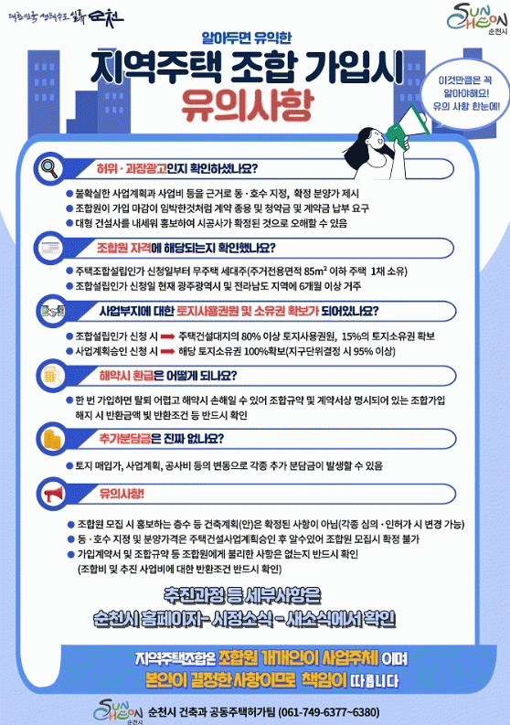 시 관계자는 “지역주택조합 사업이 지연되거나 무산될 경우 정신적・금전적 피해가 조합원 개인에게 돌아갈 수 있다”며 “조합원 가입 시 꼼꼼히 살펴보고 결정해야 한다”고 강조했다.